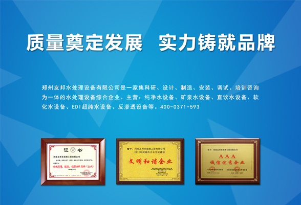 鄭州友邦水處理設(shè)備有限公司始創(chuàng)于2003年。自成立以來,友邦始終堅持以“客戶利益為保障”的原則,打造友邦口碑,備受客戶的認(rèn)可和信賴。鄭州友邦是一家專業(yè)從事水處理技術(shù)開發(fā),設(shè)備制造生產(chǎn)及銷售的企業(yè)公司。嚴(yán)格的生產(chǎn)管理系統(tǒng)環(huán)環(huán)相扣,層層把關(guān)。從原材料選購到現(xiàn)場調(diào)試安裝,鄭州友邦重視每個細(xì)節(jié)。公司以堅持技術(shù)創(chuàng)新、質(zhì)量創(chuàng)優(yōu)、服務(wù)創(chuàng)佳的原則,以優(yōu)質(zhì)的產(chǎn)品和專業(yè)的服務(wù)實現(xiàn)我們的承諾:把您擁有的水變成您需要的水!